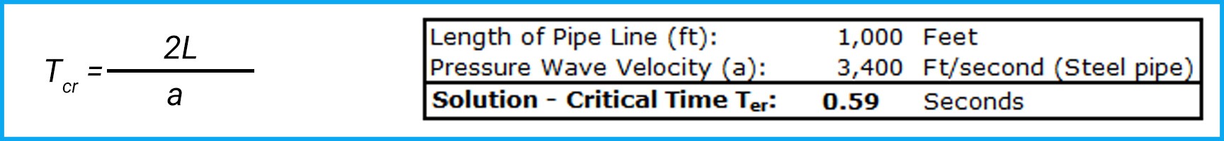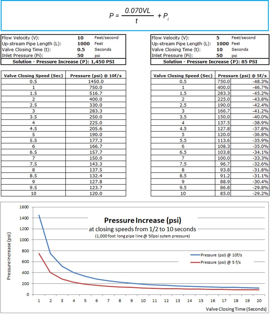 Trong các hệ thống có máy bơm lớn hơn, nên thực hiện phép tính chính xác hơn như trong ví dụ dưới đây. Các hình ảnh cho thấy sóng áp suất đột biến được tạo ra như thế nào dựa trên tốc độ đóng của van dựa trên một ví dụ sử dụng đường ống truyền dẫn dài 1.000 feet. Khi đóng van trong 1/2 giây sẽ tạo ra 1.450 psi so với khi đóng van trong 10 giây khi chỉ tạo ra xung điện 130 psi.