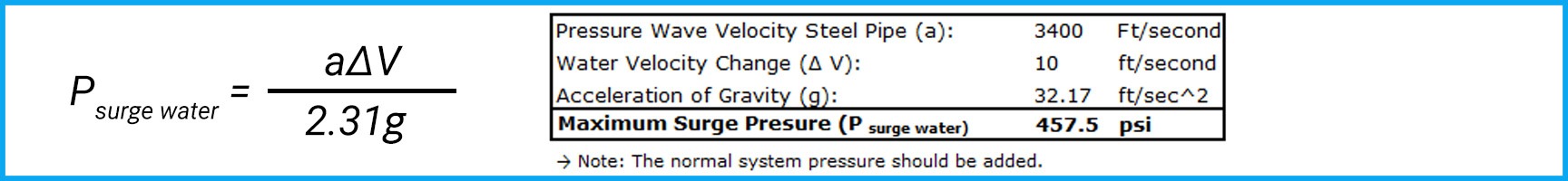 Ví dụ: nếu bạn có tốc độ dòng chảy là 10 feet/giây và đột nhiên máy bơm nước bị mất điện, bạn sẽ tạo ra áp suất tăng vọt 540 psi so với áp suất hệ thống bình thường. Nếu áp suất vận hành bình thường là 100 psi, thì áp suất tăng vọt sẽ vào khoảng 640 psi.